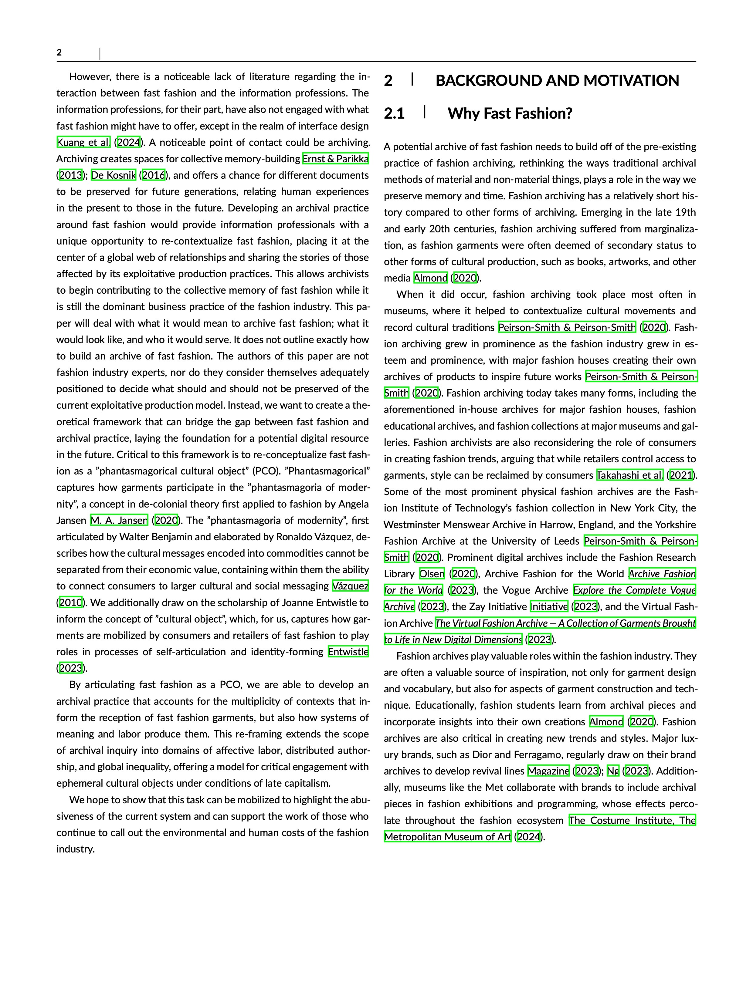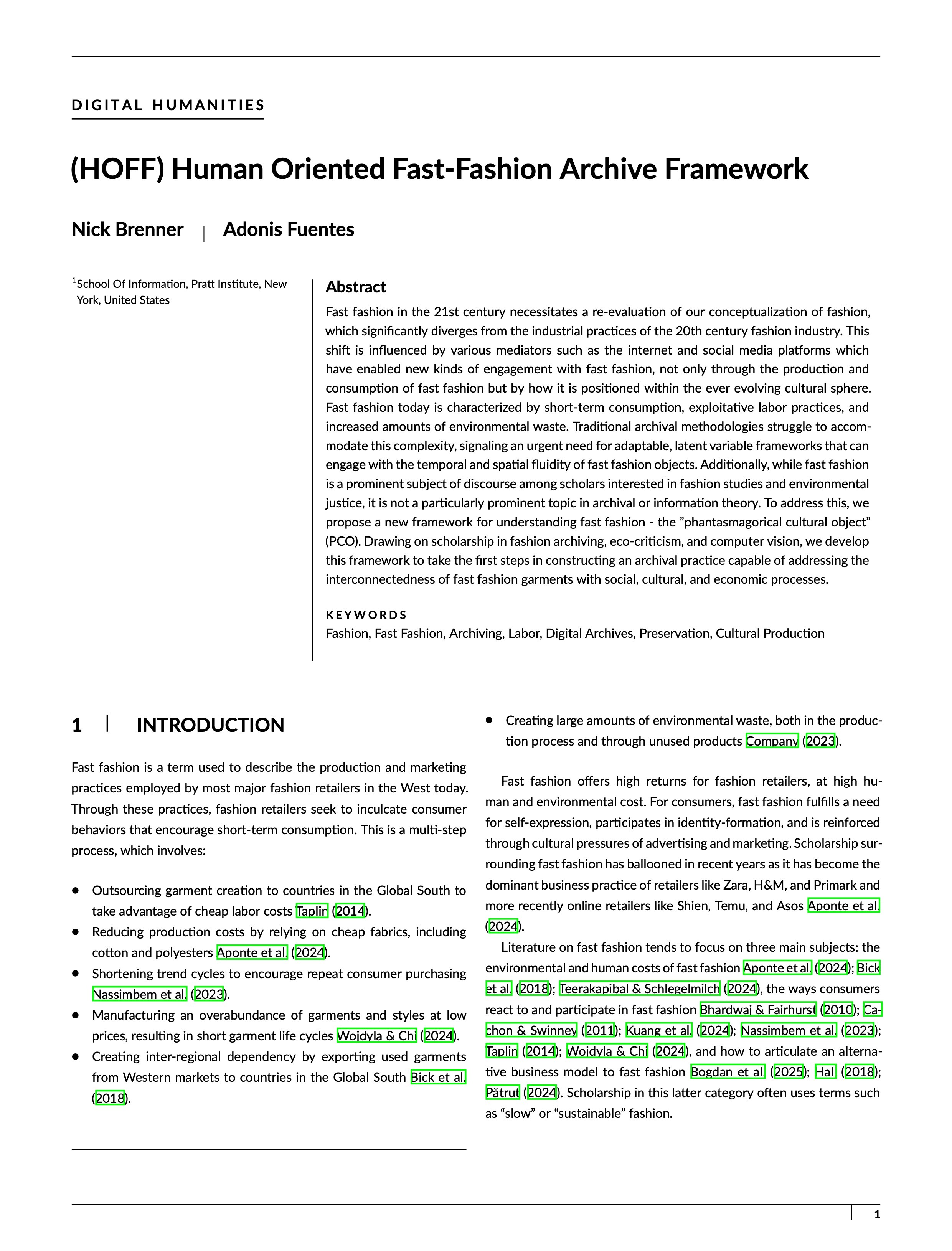 Developed as part of a Digital Humanities course, the Human-Oriented Fast Fashion (HOFF) Archival Framework examines the ethical, creative, and critical dimensions of the fast-fashion industry. A central aim of the project was to consider how archival methods of provenance and documentation could be reimagined to address a contemporary question: what would it look like to preserve objects that are always in flux within the culture? The framework sought to explore what a structured approach to capturing the many factors shaping and driving the fast fashion industry might entail.