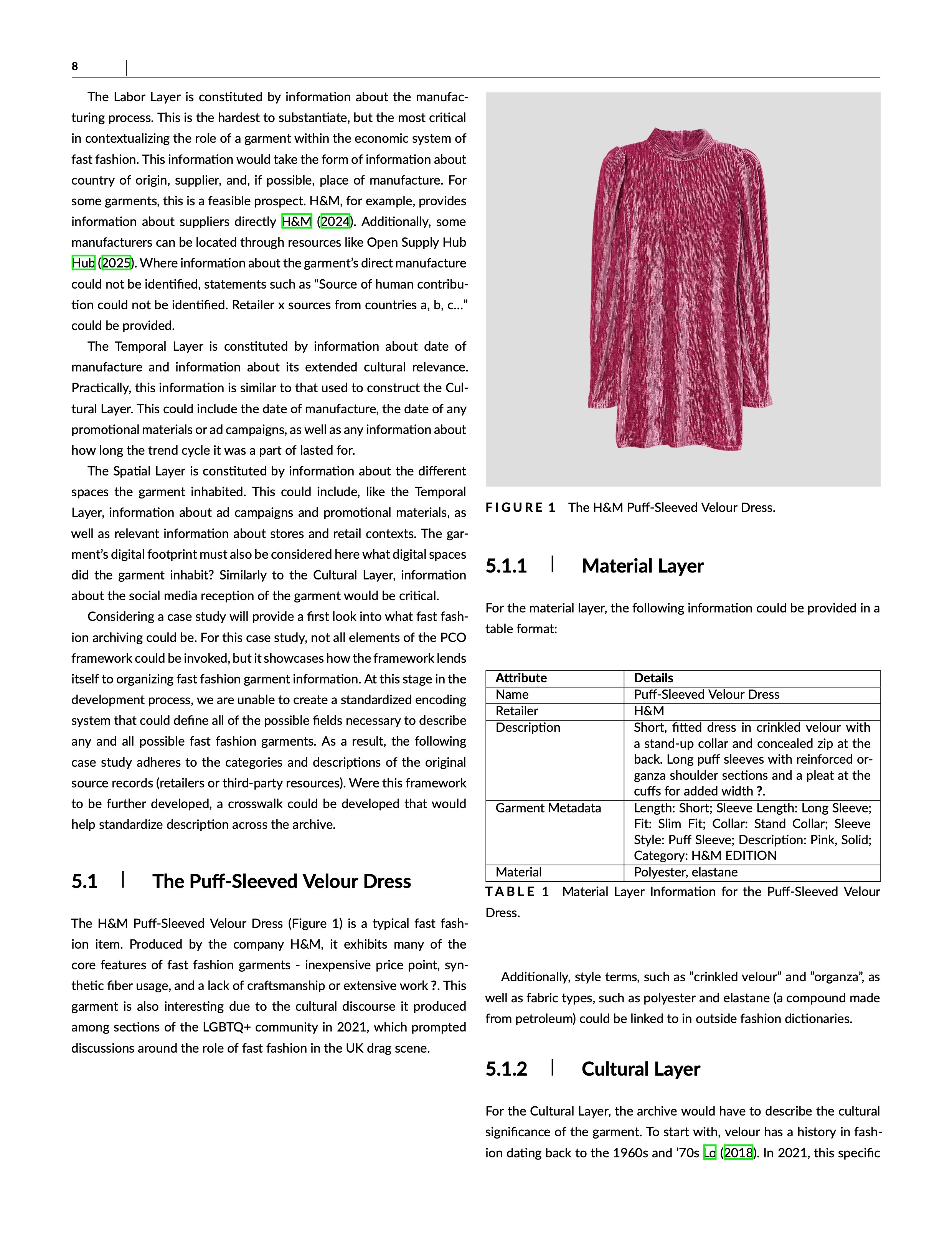 Since the project is theoretical, the process began with a review of both archival theory and current research on fast-fashion archiving to establish a foundation for the framework. Through that review, we identified a gap in how existing archival models account for objects whose cultural meaning and value are unstable. This led us to develop the concept of the "phantasmagorical cultural object," a term we coined to capture the shifting, always-in-flux nature of fast-fashion artifacts. With that concept in place, we moved into a synthesis phase, using a mix of Python and existing data scraped from Instagram related to the garment we chose for our case study to map the relationships among the materials. The outcome of that synthesis was a diagram that visualizes the connections across the five layers, offering a structured view of how these layers interact around a single garment.