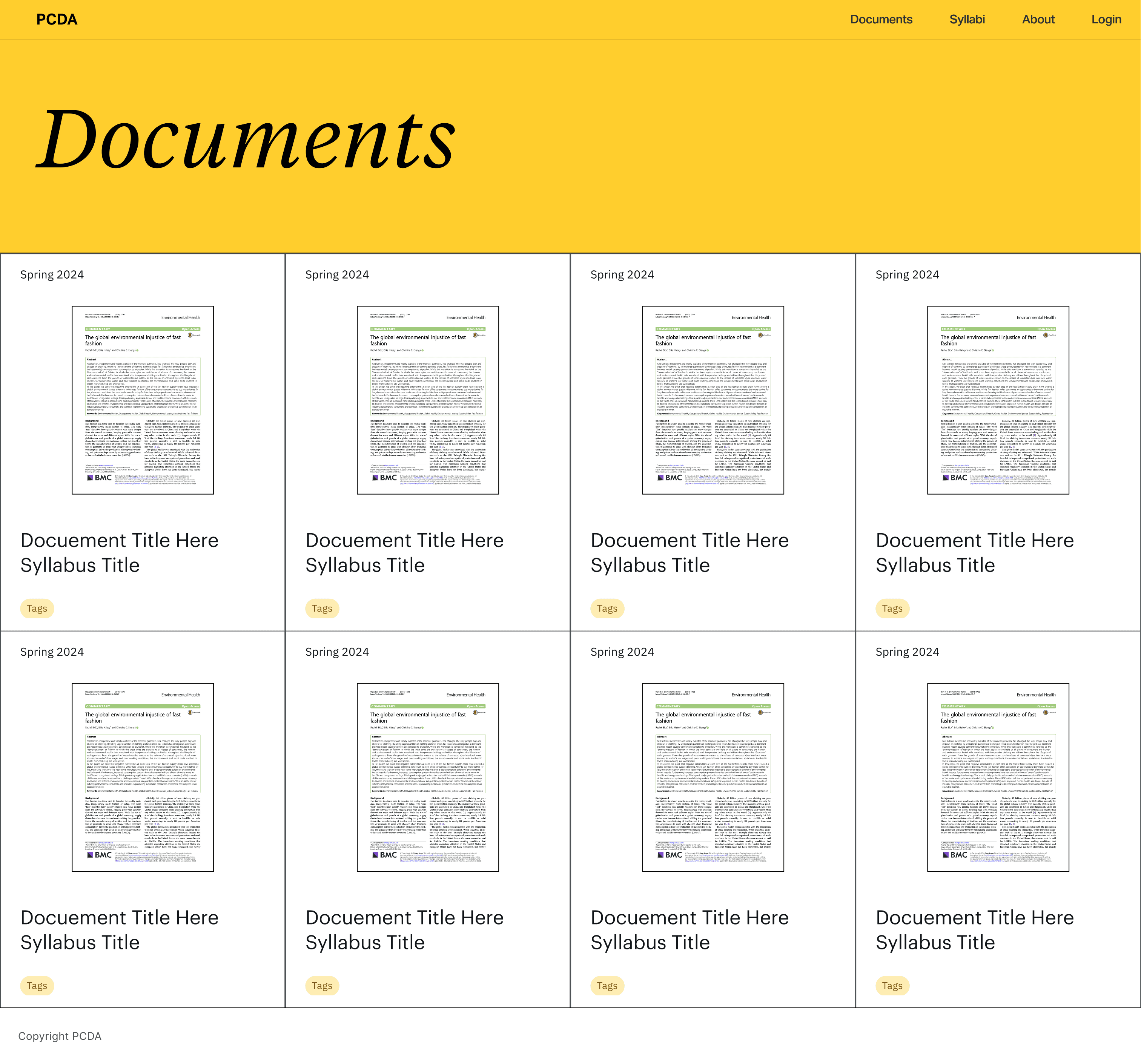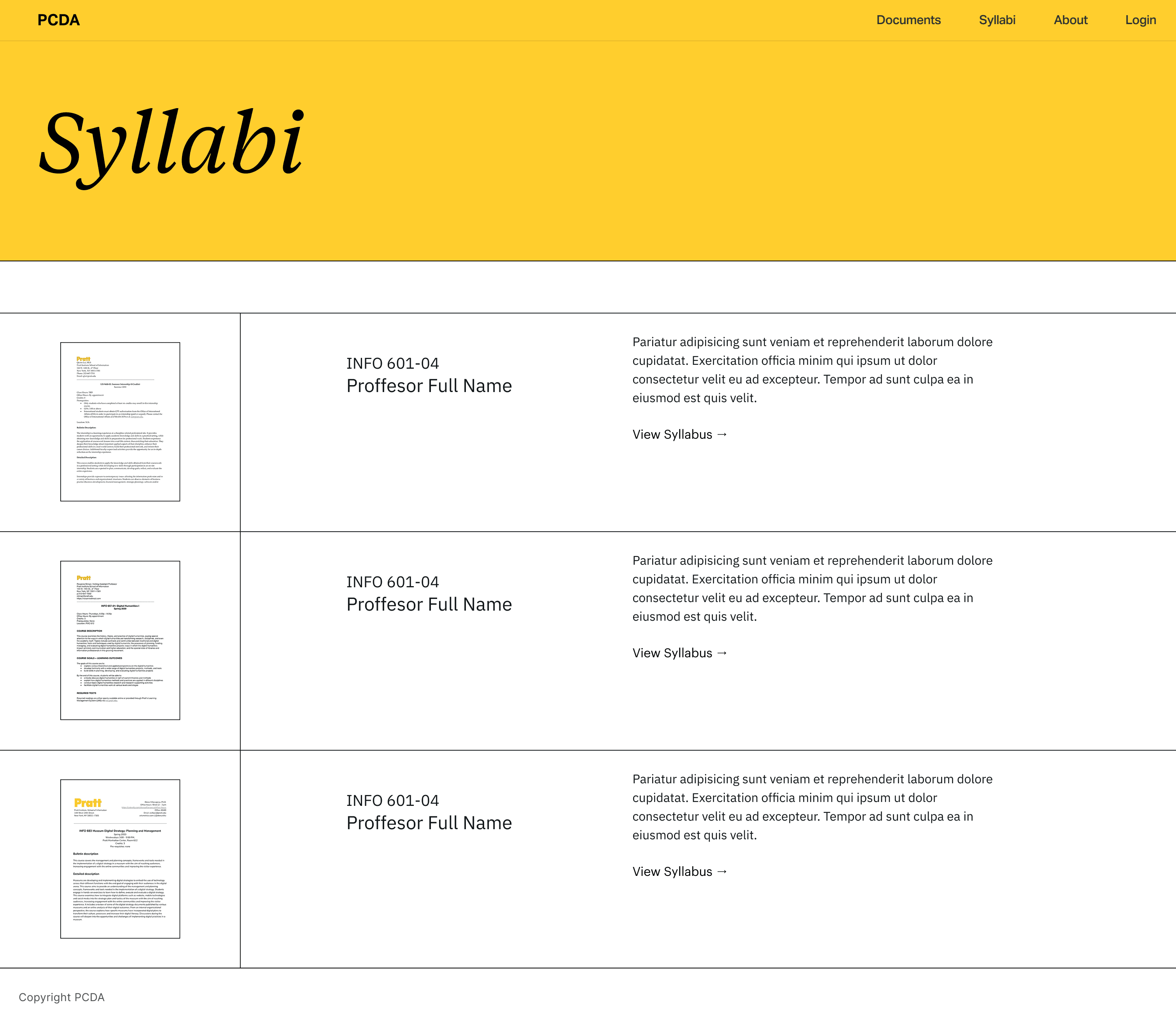 The Pratt Course Document Archive (PCDA) is a database developed to support Pratt Institute students and faculty in organizing and accessing academic course materials. Built as part of a Web Development course, the project involved designing a relational database model and integrating it with a web-based interface to manage class documents and reading lists in a structured and searchable manner.